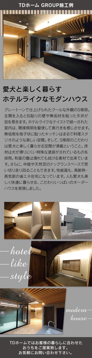 グレートーンの外観が映えるS様邸。石貼りや無垢材が彩るホテルライクな室内に、愛犬と快適に暮らせる工夫を随所に。高断熱・高気密の省エネ性能も備えた住まい。