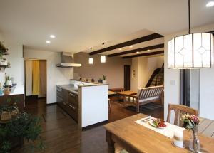 片流れと切妻屋根がスタイリッシュな和モダンハウスNo.3 ダイニング・リビング♪ ギャラリー ちょっとティータイムや一人時間を楽しむ、リビングと繋がったパティオのある生活 キッチン奥にあるパントリーは土間収納と繋がっていて家事動線がらくらく♪