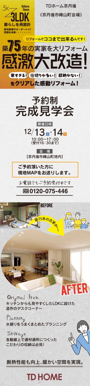 京丹後市峰山町で、築75年の実家を大リフォームで感激大改造!の家の《予約制》完成見学会を開催致します。