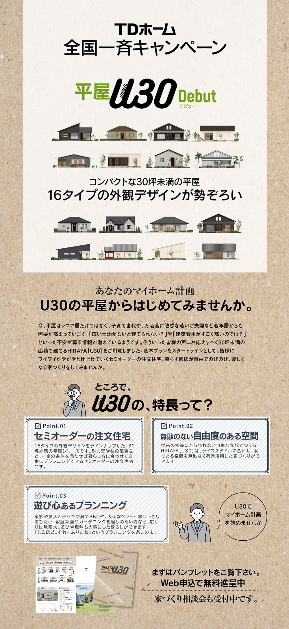 TDホーム京丹後は、京都、京丹後、与謝郡、宮津で新築の家づくりをしています。 今回、従来の常識にとらわれない自由な発想でつくる30坪未満の面積で建てるHIRAYA【U30】のパンフレットを無料で差し上げます。