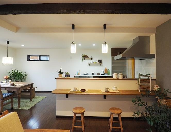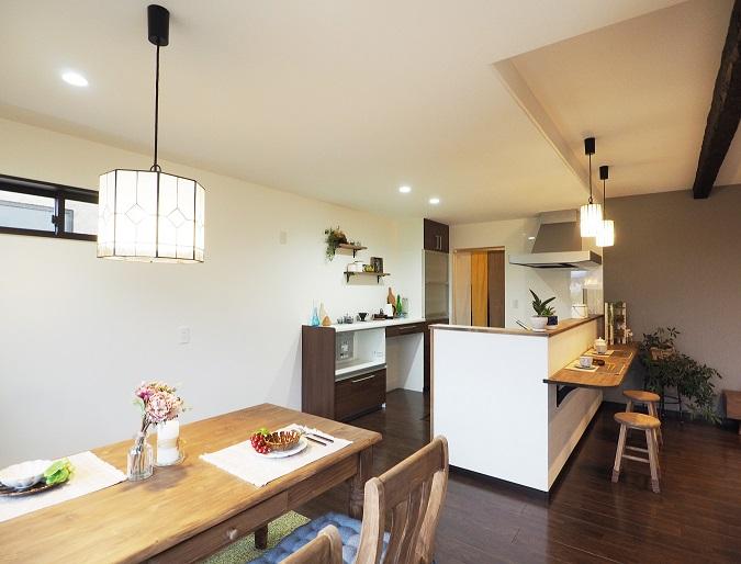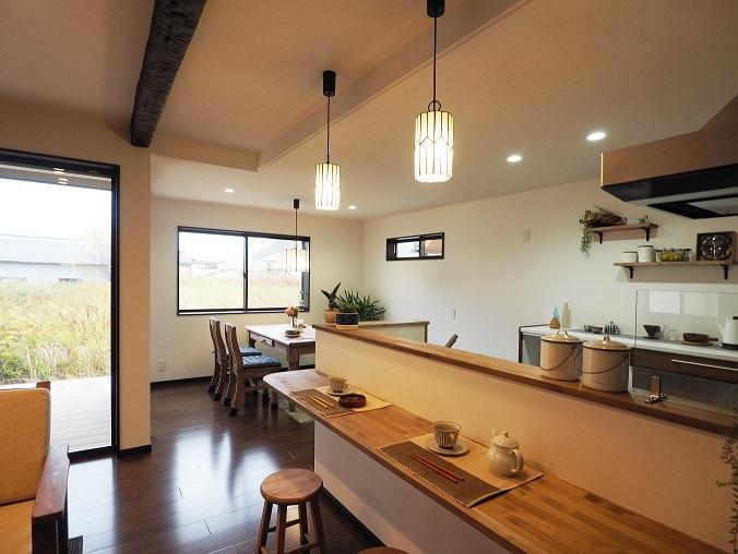片流れと切妻屋根がスタイリッシュな和モダンハウスNo.3 ダイニング・リビング♪ ギャラリー ちょっとティータイムや一人時間を楽しむ、リビングと繋がったパティオのある生活 キッチン奥にあるパントリーは土間収納と繋がっていて家事動線がらくらく♪