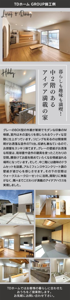 グレーのBOX型外観が映えるM様邸。木の温もり溢れる室内に造作TV台や琉球畳の和室、中二階のドラムスペースなど遊び心と収納力を備えたアイデア満載の住まい。