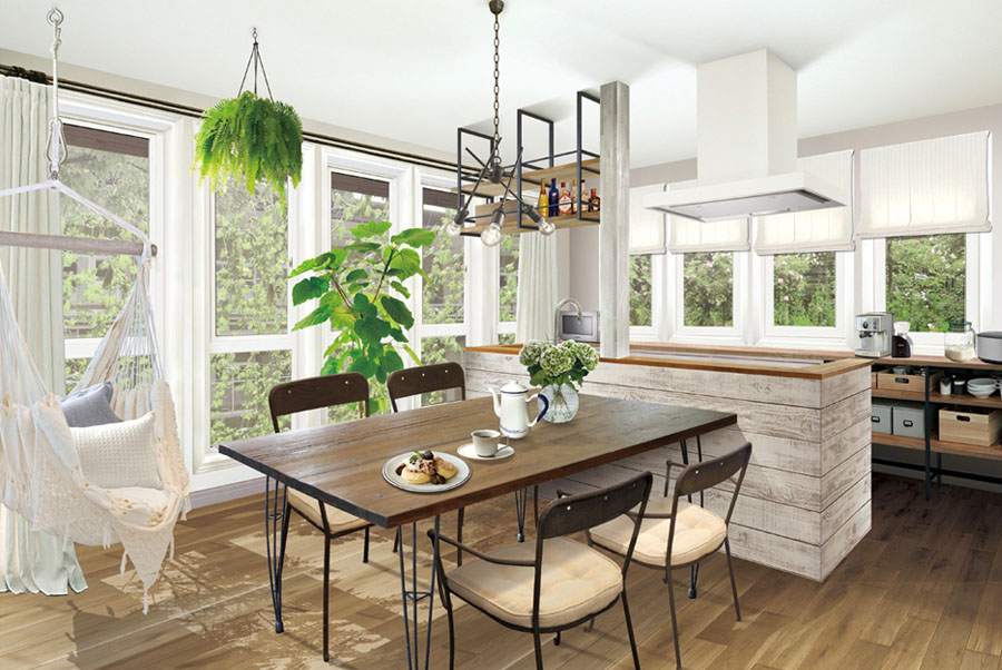 光と風がつくり出す、木漏れ日の中で過ごすキッチンダイニング。