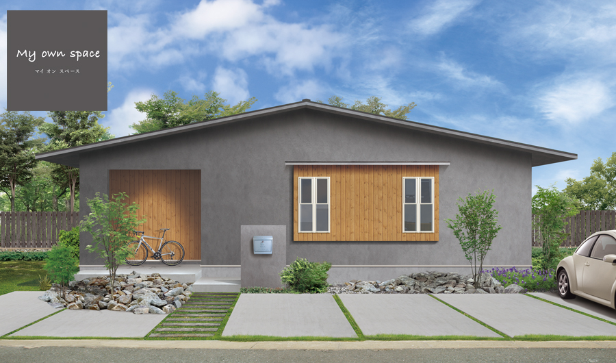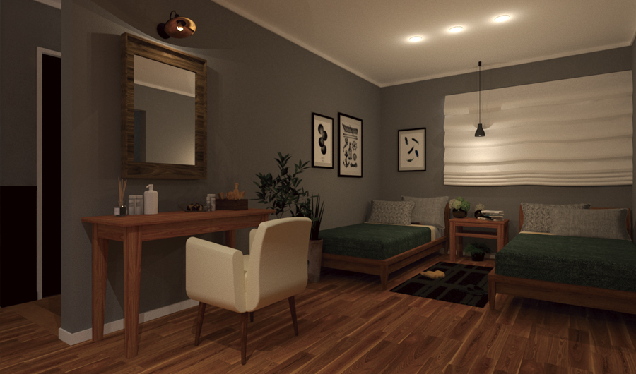 主役的な大きなソファーを中心に、DKスペースとベッドスペースが囲む、